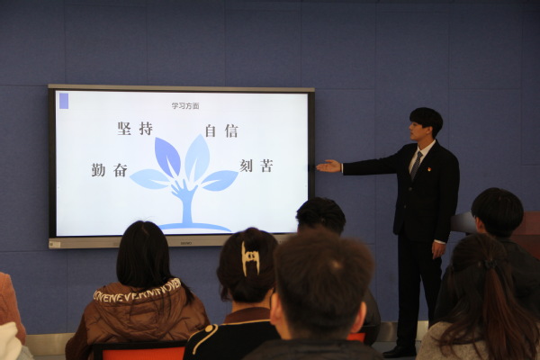 在本次活动中,周新豪作为优秀的学生代表、大学生创新创业大赛一二等奖的获得者,结合自身丰富的实践经历,从“学习、工作和实践”三个方面展开,为同学们提供经验,分享心得。 周新豪同学着重讲述了学习和工作方面,学习上,强调“勤奋 坚持 自信 刻苦”,在有目标的同时,也要用勤奋和努力来加持。而工作方面,从四个侧重点“谋划、全局、细节、协调”为同学们提供工作方法。简洁明了。