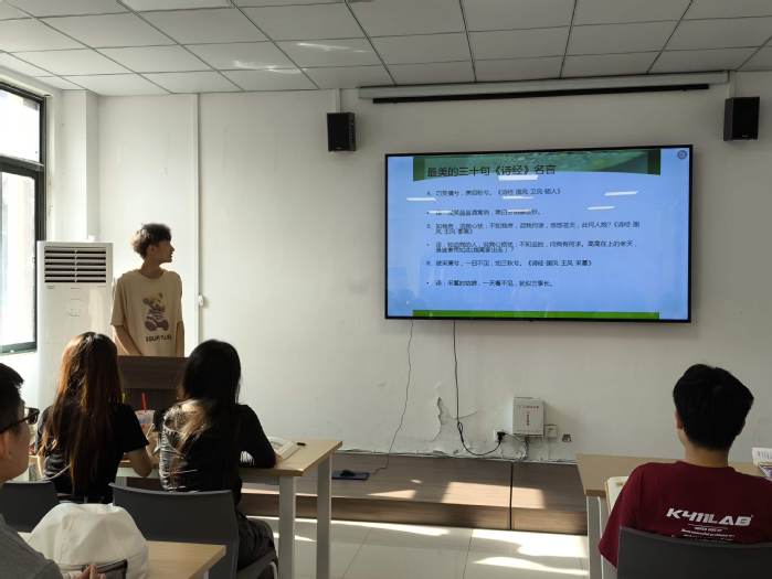 交流会上,主持人首先带领大家回顾了《诗经》主要内容、主题、风格及相关文学常识。接着,大家共同朗诵《诗经》名篇《周南·关雎》《王风·黍离》和《秦风·无衣》,三首诗歌选自不同的“国风”,具有迥异的内容风格和思想表达,让大家感受到《诗经》作为我国第一部诗歌总集丰富深厚的内涵和魅力。随后,大家分享交流自己学习、阅读其中诗歌篇目的理解和感悟,分享自己喜欢的诗歌并进行探讨。最后,大家欣赏了由名篇《蒹葭》改编、邓丽君演唱的经典歌曲《在水一方》,共同体味其蕴含的深刻情感。