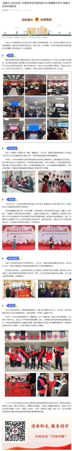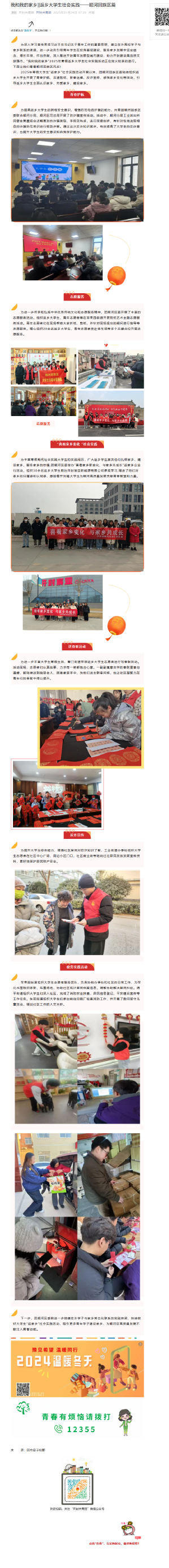 张潇予寒假期间参与丰富的返家乡活动,在家乡县级政府机关实习,积累了宝贵的工作经验。参加了慰问老人残疾人活动。参与物资搬运,运输,将物资运回办事处。还参与义写春联,为大家送去新春祝福;在养老院陪伴老人,给他们带去温暖;也和志愿者一起清扫街道维护城市环境。这些经历让我成长,我也希望能继续为家乡出一份力。