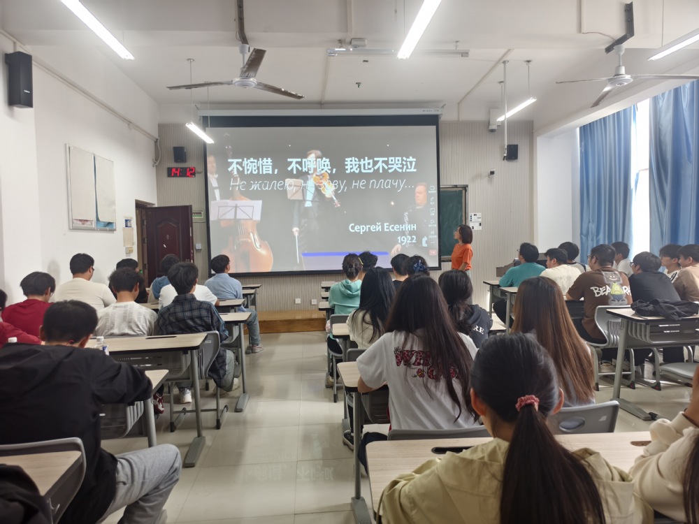 活动伊始,主讲老师深入浅出地介绍了俄罗斯诗歌的发展历史。从早期的民间诗歌到古典主义诗歌,再从俄罗斯诗歌的黄金时代到白银时代,俄罗斯诗歌在不同的历史时期呈现出不同的风格与特点。学生们仿佛穿越时空,见证了俄罗斯诗歌从萌芽到繁荣的全过程。随后,活动进入了重点环节——介绍俄罗斯诗歌的代表人物及其代表作。主讲老师通过朗诵、讲解和赏析相结合的方式,带领学生们领略了普希金、莱蒙托夫、阿赫玛托娃、茨维塔耶娃、叶赛宁等经典诗人的传世作品,并通过视频展示了《你的名字》(Имя твоё)、《我想和你一起生活》(Я бы хотела жить с вами)、《假如生活欺骗了你》(Если жизнь тебя обманет)、《不惋惜,不呼唤,我也不哭泣》(Не жалею, не зову, не плачу)等经典诗歌的内涵及创作背景,进一步加深了对俄罗斯诗歌的理解和认识。