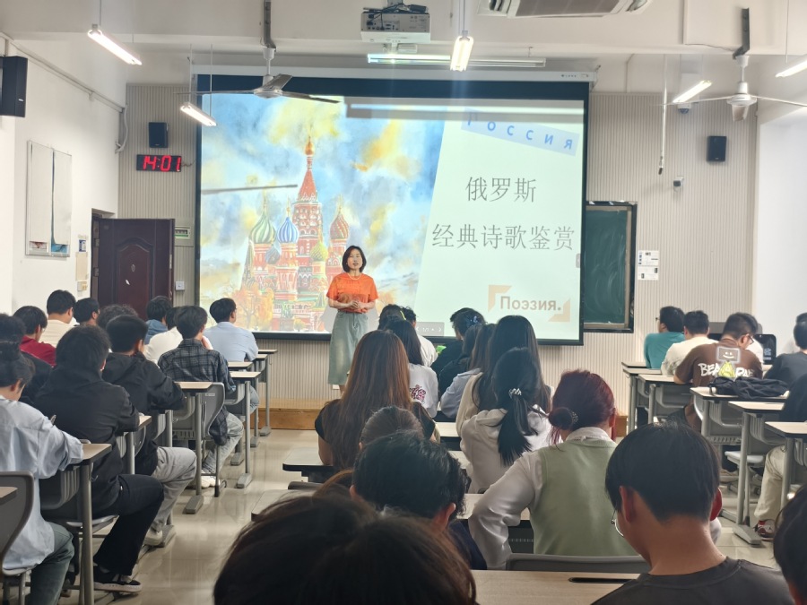 在活动互动环节,学生们积极发言,分享自己对俄罗斯诗歌的理解和感悟。有的学生还在老师带领下饱含感情地跟读了俄罗斯经典诗歌,充分感受到俄罗斯诗歌的韵律之美、情感之美和思想之美。