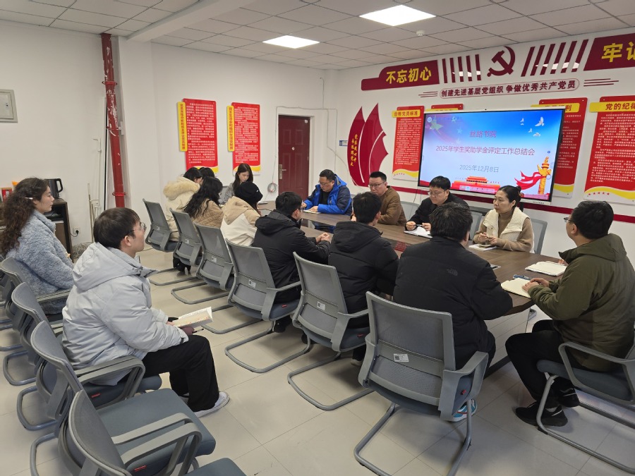 2025年12月8日,丝路书院在二楼党员会议室召开2025年学生奖助学金评定工作总结会,书院领导班子及全体辅导员参加,会议由学工办主任张晓远主持。