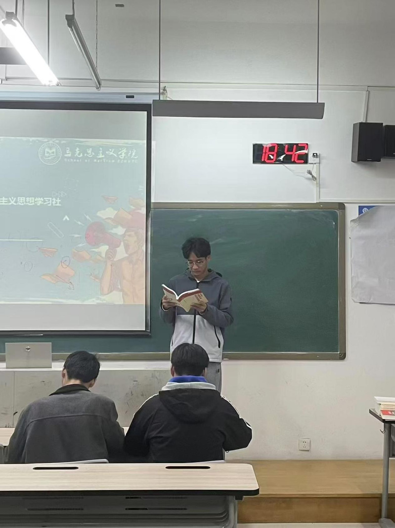 会上,学习社团支书王金超说明了举办此次活动的目的,介绍了活动的具体过程。他强调,“读书是获取知识的途径,更是修身养性、启迪智慧的重要方式。”学习社负责人周志武则强调,深入学习并贯彻习近平文化思想,担起新的文化使命,积极发挥社团特色优势,传承红色基因,投身“书香校园”建设。