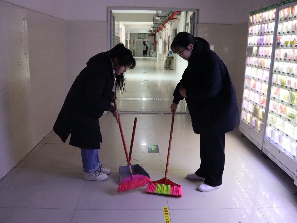此次活动由各楼层社区负责人向参与学生传达活动任务、打扫区域以及相关要求。负责人传达完毕,参与学生开始进行打扫。在室外打扫的同学用扫把和簸箕将地面上枯枝落叶清扫倒入垃圾桶内,对于细小且难以清扫的垃圾采用拾捡方式;在室内打扫的同学将垃圾清理完后,将室内的窗户擦拭、地面用干、湿拖把拖去地面污渍。