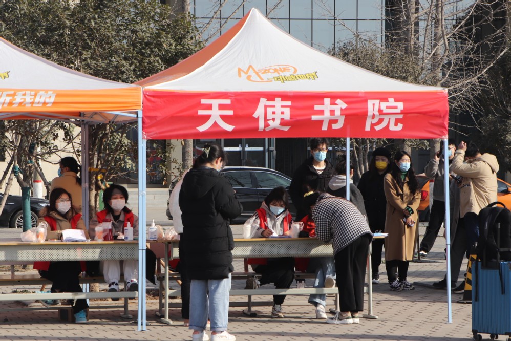 2022年2月26日早上八点,天使书院的志愿者在铁龙广场设立的服务点集合,为即将返校报到的学生提供志愿服务。书院领导及全体育人导师深入学生返校一线,来到学校检查指导学生返校报到工作。