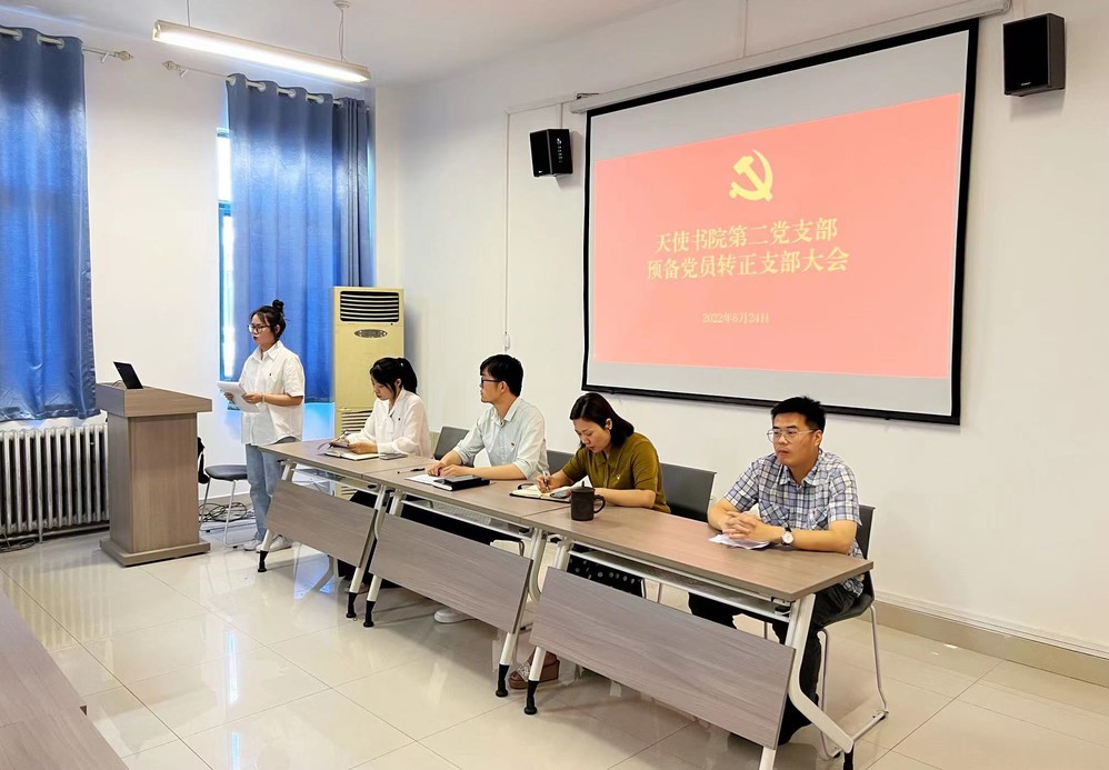 2022年6月24日,天使书院党总支第二党支部在书院三楼报告厅召开学生预备党员转正支部大会,讨论32名学生预备党员转正事宜。书院党总支第二党支部书记王小珂、支部委员马鹏飞及支部全体党员参加会议,书院党总支副书记王翡翡、组织员李文煜、第一党支部委员刘旭鹏列席。会议由王小珂主持。