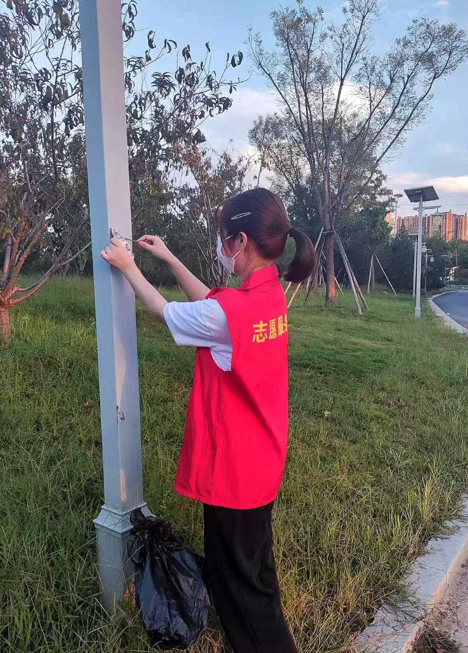 7月12日,志愿者们以“绿色整洁”为主题,在村里道路上清理了垃圾以及电线杆上的小广告。