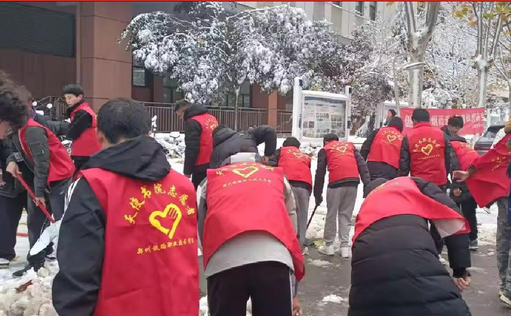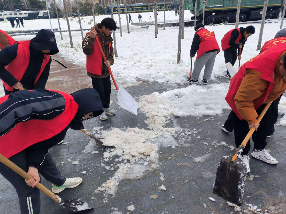 寒风凛冽、天气寒冷,但同学们不畏严寒在校园及书院公共区域展开扫雪活动。学生志愿者们手拿铁锹、扫把清扫积雪,经过近两小时的奋战,顶着寒风以最快的速度将积雪清理干净,打通了一条条可平安行走的校园“安全通道”,用实际行动展现了“奉献、友爱、互助、进步”的志愿服务精神。