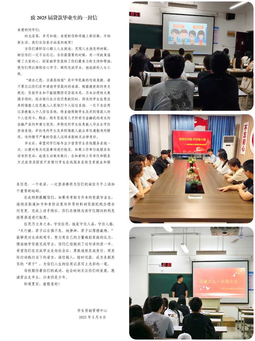 “诚贷·践诺”筑基固本:毕业确认强化诚信守诺责。活动以“一封信、一部片、一场会、一声誓”为主线,引导学生树立“诚信立身,感恩笃行”的价值理念,为毕业生迈入社会筑牢诚信基石,助力其成长为担当有为、恪守承诺的时代新人。