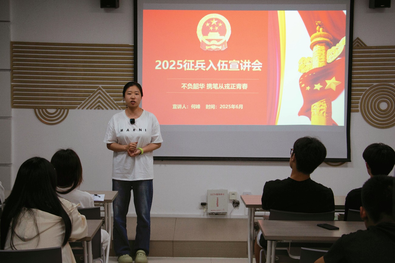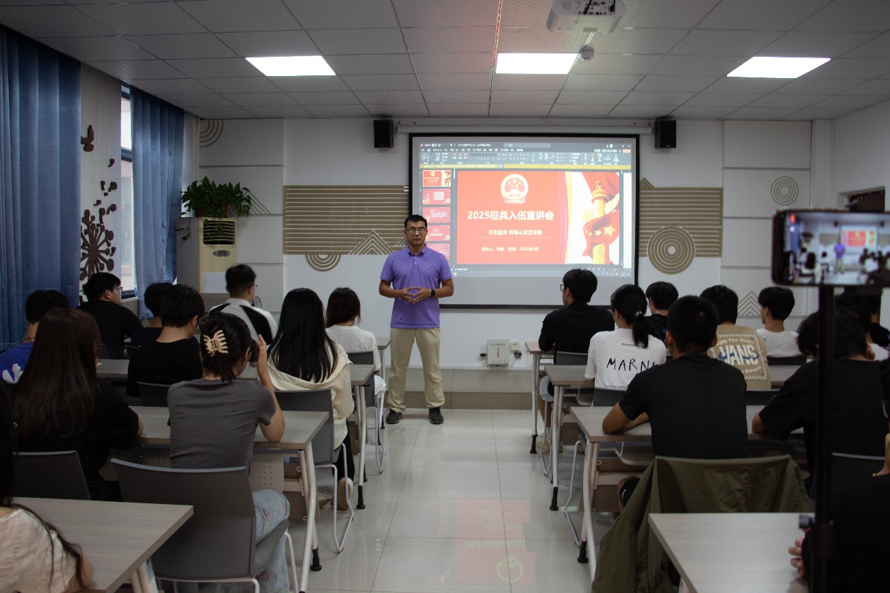 活动伊始,何峰老师围绕2025年征兵政策展开深度解读。从大学生参军的基本条件、报名流程、时间节点,到学业保留、考研加分、就业扶持等专属优惠政策,结合具体案例逐条解析,重点阐释“参军入伍既是履行公民义务,更是青年成长成才的重要途径”。他强调,国家为大学生士兵提供了全方位的发展保障,鼓励同学们把个人理想融入国防建设,在军营中淬炼意志、实现价值。