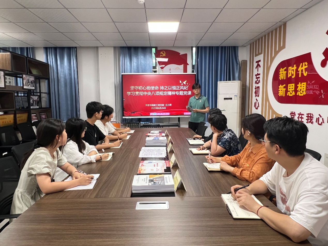 6月26日下午,天使书院教工党支部在二楼会议室开展学习贯彻中央八项规定精神专题党课。本次党课以“坚守初心担使命,持之以恒正风纪”为主题,由党支部书记王小珂主讲,全体支部成员和部分学生代表参加学习。党课聚焦新时代教师队伍建设,深入探讨作风建设与育人工作的有机统一。