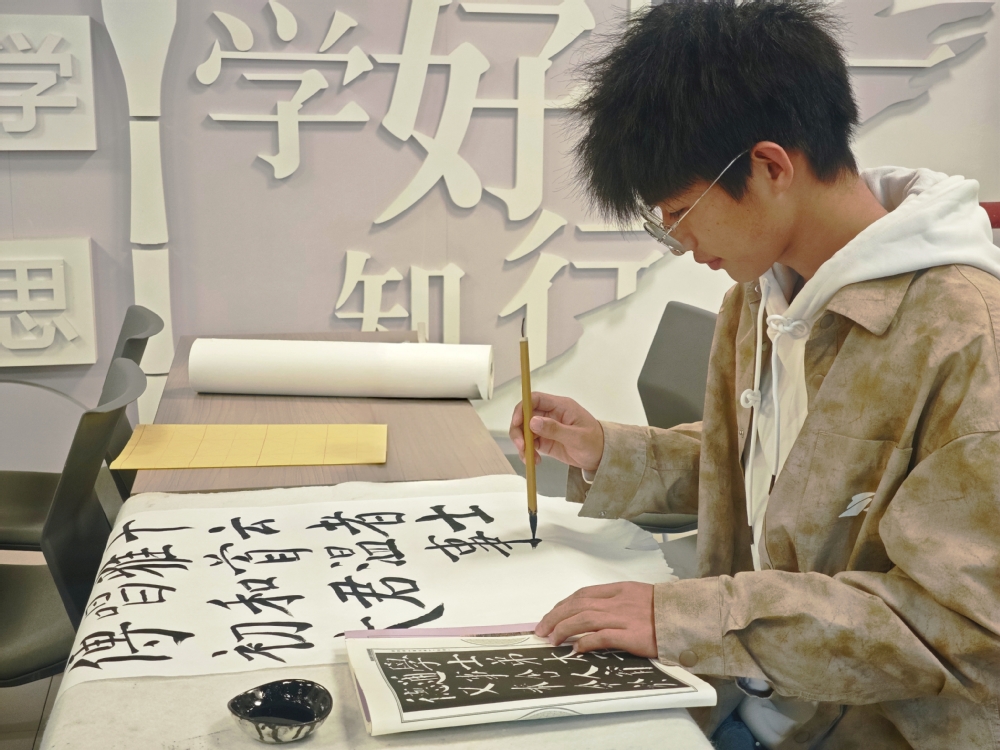活动现场墨香氤氲,文房四宝与经典碑帖一应俱全。同学们在指导下择帖展纸,沉浸于笔墨世界。或凝神揣摩字帖气韵,或专注体会笔墨浓淡,在一撇一捺间感受汉字节奏之美,在提按转折中领悟传统文化精髓。现场交流互动频繁,艺术氛围浓厚温馨。参与学生普遍表示,此次活动既是一场美的熏陶,更是一次心灵的滋养。大家在笔墨流转中不仅提升了审美素养与动手能力,更深切感受到中华优秀传统文化的魅力。