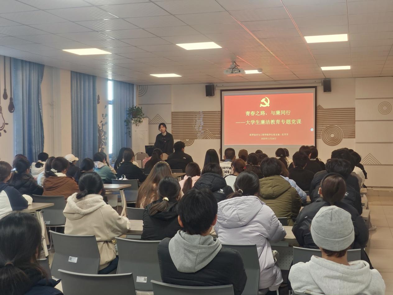 为深入贯彻落实全面从严治党要求,切实增强大学生廉洁自律意识,11月28日,医学技术与工程学院学生党支部书记沈芳芳为2025级入党积极分子讲授题为“青春之路,与廉同行”的廉洁教育专题党课。