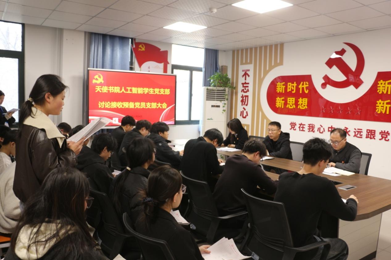为严格规范党员发展工作程序,切实提升新发展党员政治素养,筑牢党支部建设根基,11 月 24 日上午,天使书院人工智能学生党支部在书院二楼党团活动室召开接收预备党员支部大会。大会由支部书记朱军涛主持,支部全体党员、入党介绍人及 19 名发展对象参会。