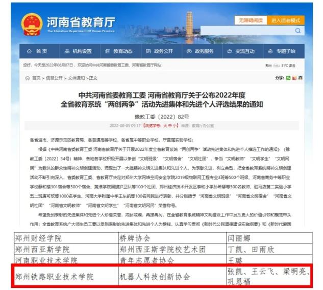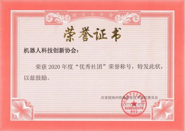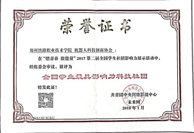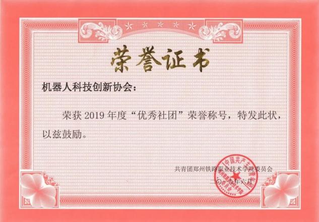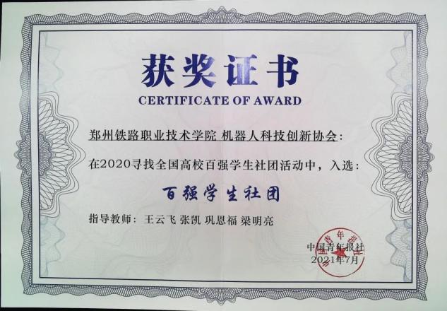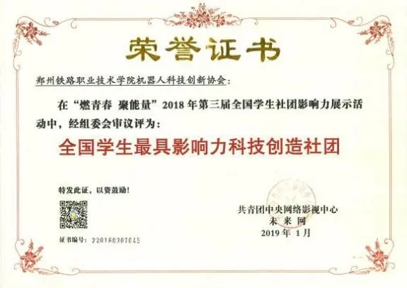 beat365英国官方网站机器人科技创新协会获得了“全国学生最具影响力科技社团”、“全国学生最具影响力科技创造社团”、“全国百强学生社团”、“河南省文明社团”学校“优秀社团”等荣誉称号。近几年社团优秀会员参加各类全国、省级学科类竞赛取得了骄人的成绩,累计获得国际赛三等奖1个、全国一等奖20个、全国二等奖12个、全国三等奖3个,河南省特等奖1个、河南省一等奖68个、河南省二等奖76个、河南省三等奖91个。在社团指导老师及机器人科技创新协会团支部的带领下,社团优秀会员在科技创新项目孵化及培育的过程中共申请国家专利50余项,已授权33项,创立了4家以学生为法人的公司。学生在科技创新竞赛中成长学习,培养了学生社会责任感及创新精神,提高了学生的实践能力,提升了学生的综合素质,促进学生成长成才。下面是荣誉展示: