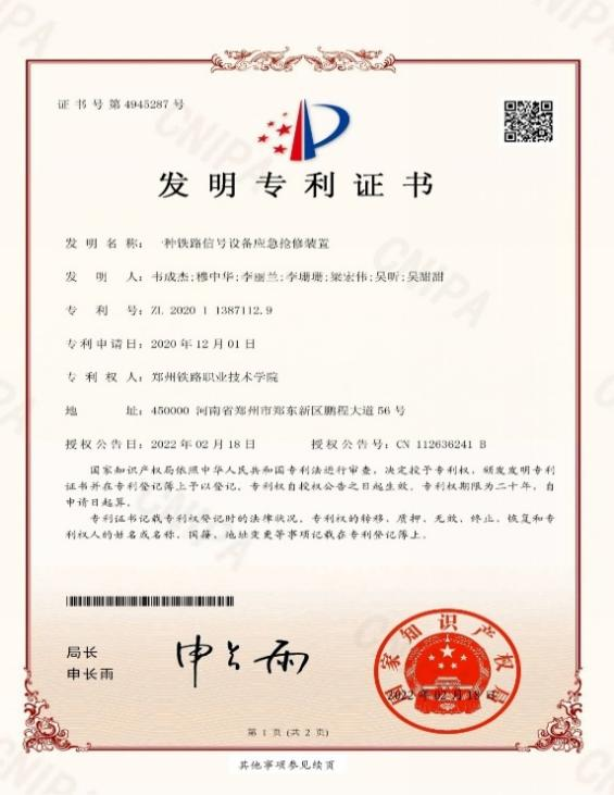 协会教师们坚持“学科专业与虚拟仿真技术深度融合”,以全面提高高校学生工程素质、创新意识和工程实践综合能力为宗旨,以共享优质实验教学资源为核心,以建设信息化实验教学资源为重点。以学术带头人韦成杰老师、梁宏伟老师、吴甜甜老师、占雪梅老师等为核心,建立了一支教育理念先进、教学水平高、结构合理、教学与科研能力强的实验教学队伍。其中韦成杰老师2020年9月Journalof Vibroengineering杂志发表论文:Railway foreign body vibration signal detection based on wavelet analysis;占雪梅老师2021年1月发表论文:Rearch on speed sensor fusion of urban rail transit train speed ranging based on deep learning。导师们在科技创新项目上也一展风采,在项目孵化培育中申请以下专利:(1)2022 年韦成杰等,发明专利:一种铁路信号设备应急抢修装置(2)2022 年韦成杰等,发明专利:一种电子零件安装装置(3)2021 年韦成杰等,发明专利:一种铁路联锁信号管理系统(4)2021年占雪梅等,发明专利:一种具有减震效果的铁路信号设备机柜(5)2020年吴甜甜等,实用新型专利:一种便于维护的铁路信号机(6)2022年吴甜甜等,实用新型专利:一种铁路障碍物检测预警装置(7)2021年韦成杰等,实用新型专利:一种互联网教学平台的信号发射装置(8)2020年吴甜甜等,实用新型专利:一种用于铁路钢轨铺设中的轨距校正装置。