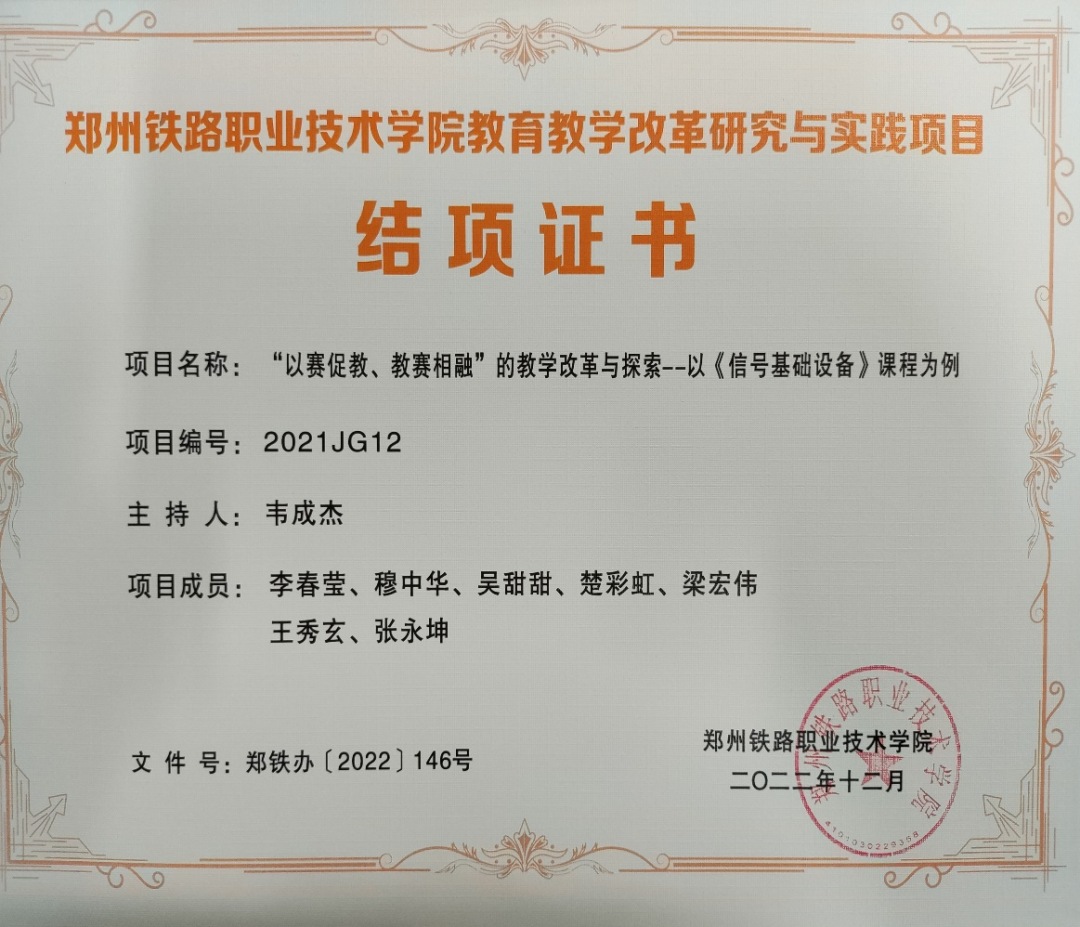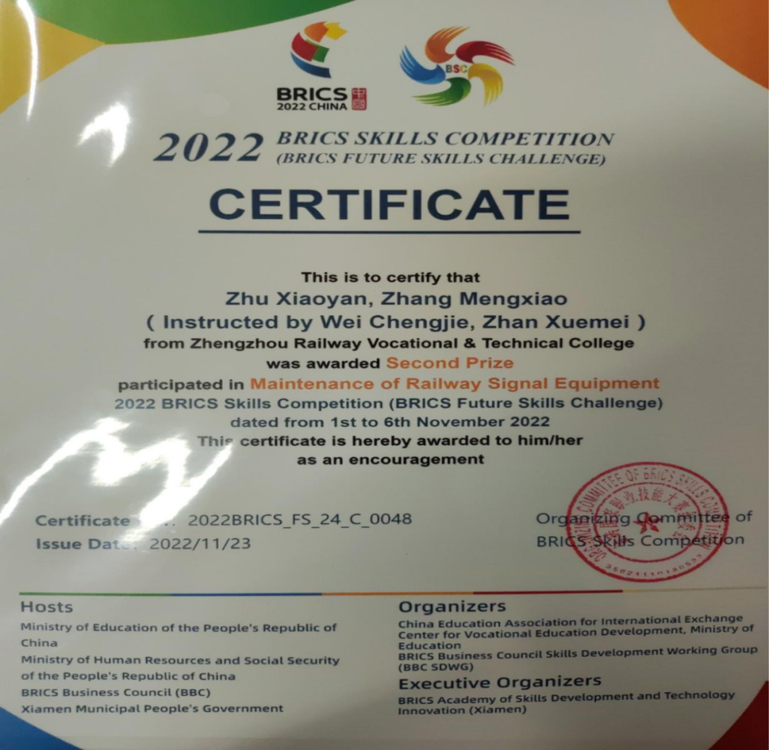 beat365英国官方网站轨道交通信号协会在社团指导老师的带领下,每年都会积极参加全国职业院校技能大赛、河南省铁路与轨道交通职业技能竞赛、金砖国家职业技能大赛、一带一路金砖国家技能发展与技术创新大赛等。在协会成员的共同努力下轨道交通信号协会获“全国职业院校技能大赛”一等奖、“河南省铁路与轨道交通职业技能竞赛”一等奖、“金砖国家职业技能大赛”二等奖、“一带一路金砖国家技能发展与技术创新大赛”二等奖等。