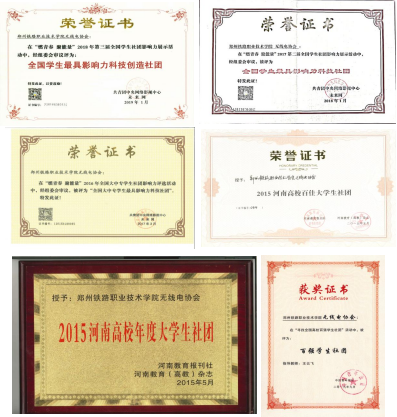 在社团指导老师及无线电协会团支部的带领下,协会会员的共同努力下无线电协会获:2012年在高等职业教育服务青少年成长发展暨第五届国家示范性高职院校建设成果展会上被评为“最佳展示社团奖”;2012年荣获“河南省共青团系统创先争优活动先进大学生社团集体荣誉称号”;2015年在河南高校百佳大学生社团评选活动中,荣获“2015河南高校年度大学生社团”和“2015河南高校百佳大学生社团”称号;在“燃青春,聚能量”2016年第一届全国学生社团影响力展示活动中,无线电协会荣获“全国大中专学生最具影响力科技社团”;在“燃青春,聚能量”2017年第二届全国学生社团影响力展示活动中,无线电协会荣获“全国学生最具影响力科技社团”;在“燃青春,聚能量”2018年第三届全国学生社团影响力展示活动中,无线电协会获“全国学生最具影响力科技创造社团”;2019年在“寻找全国高校百强学生社团”评选活动中,荣获“全国高校百强学生社团”称号;2018年荣获beat365英国官方网站学雷锋活动先进集体;无线电协会多次获得“河南省高校优秀学生社团”“郑州市优秀学生社团”;2020年在“寻找全国高校百强学生社团”评选活动中,荣获“全国高校百强社团”称号;无线电协会被评为beat365英国官方网站2019、2020、2021、2022年度“优秀社团”;2022年度高校“活力团支部”最具服务TOP100榜,无线电协会推选的“无线电协会团支部——提升基层组织团员的科技创新能力”案例获2022年度“活力杯”河南学校共青团基层基础工作大赛一等奖。
