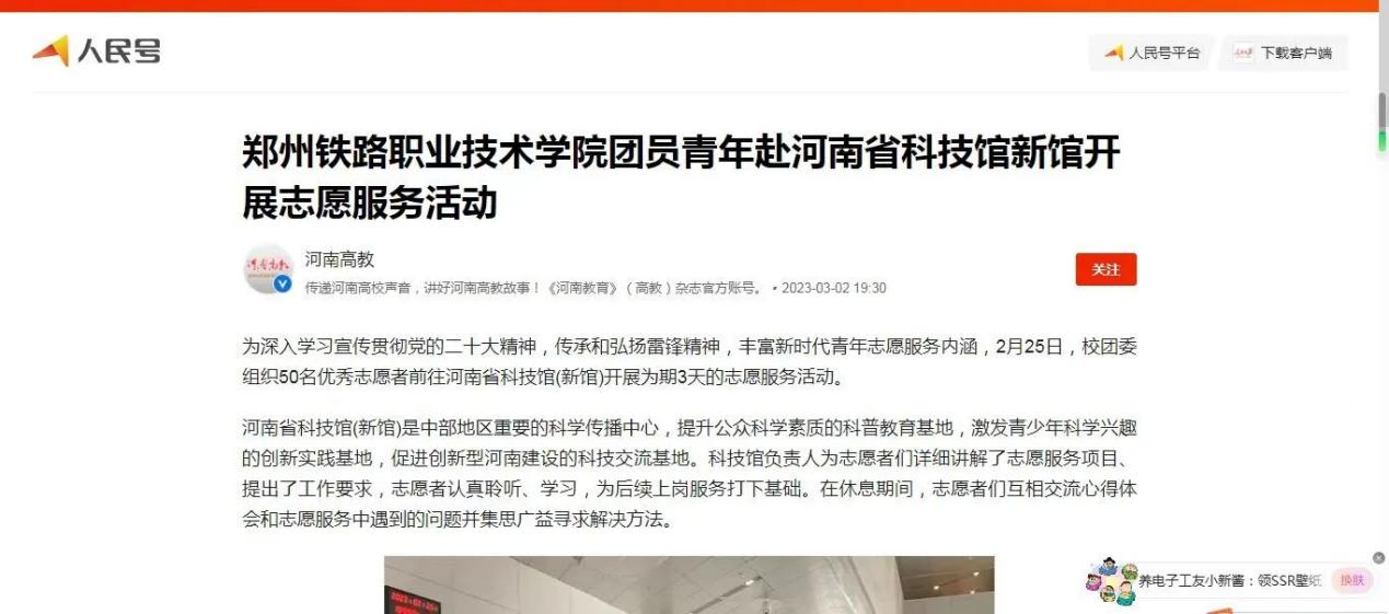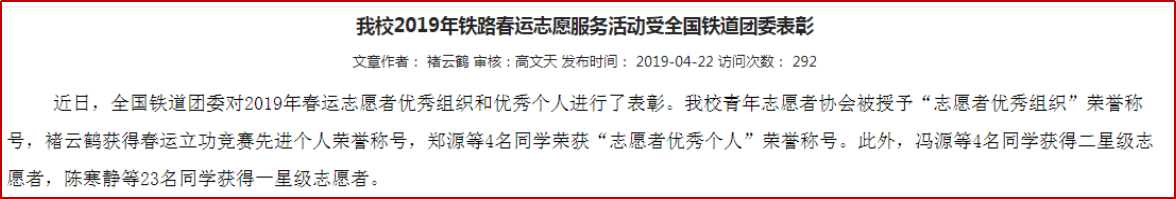 “情暖旅途,铁路青年志愿服务活动”被中央电视台、新浪网、人民日报、学习强国、河南教育宣传网、河南高教、郑州电视台等多家媒体广泛报导,深受社会各界一致好评,被列为河南省普通高等学校“出彩中原”大学生社会实践活动唯一一所高职高专入选的重点项目,目前已顺利结项,荣获第六届中国青年志愿服务项目大赛河南省赛金奖和河南省优秀志愿服务项目;在河南省科技馆开展的“助力科普文明实践”活动,赢得了科技馆工作人员和游客的广泛好评,被人民日报等媒体报道;开展的“乡村振兴”“社区治理”志愿服务被河南学联、豫教思语公众号专题报道,爱心文具捐赠、医疗义诊、非遗剪纸艺术进校园等志愿活动被河南日报报道,“趣读团队”被团中央遴选为三下乡国家重点团队,趣读乡村儿童阅读推广项目被评为2022 年全省暑期“三下乡”社会实践活动优秀品牌项目,在学校和社会上产生了积极的影响。