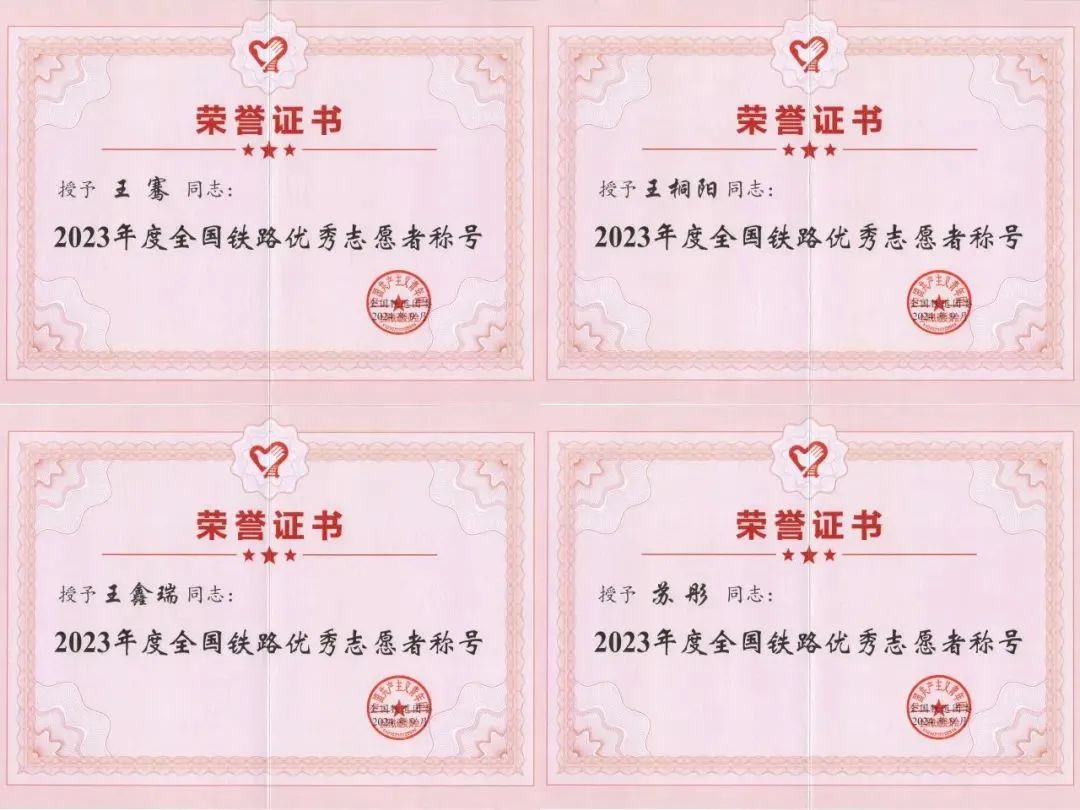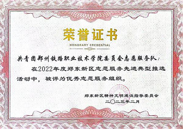 协会先后获评全国铁道团委优秀志愿者组织、春运立功竞赛先进集体、郑州市优秀志愿服务团队、郑东新区优秀志愿服务组织等荣誉称号。近5年全国铁道团委春运立功竞赛共获得先进个人5人,志愿者优秀个人10人,二星级志愿者4人,一星级志愿者208人;1人被评为河南省优秀志愿者,4人被评为河南省“快乐成长”乡村学校少年宫文艺志愿服务优秀志愿者;1人被评为郑东新区优秀志愿服务工作者,1人被评为优秀志愿者。