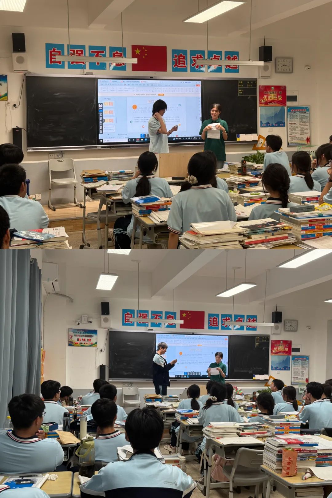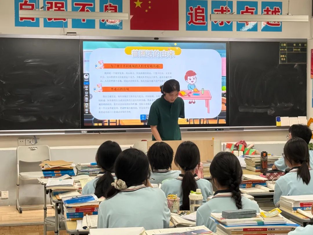 追溯“普通话的由来”时,时间轴在屏幕上缓缓展开:从孔子周游列国用“雅言”讲学,到民国时期“国语统一”运动,再到1955 年“普通话”定名——“它不是凭空出现的,是历史选出来的‘共同语’,就像你们的校服,既有统一的规范,也能穿出各自的风采。”