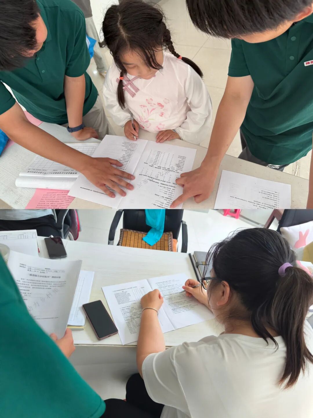 为学龄前儿童特设的“拼音抽奖”掀起高潮,孩子们抽中印着 “bà ba”“mā ma”的卡通贴纸,举着跑向家长:“爸,妈,这样念对不对?” 全体合影时,大家共同拉起“推普助力乡村振兴”的旗帜,笑容比檐角的阳光还灿烂。