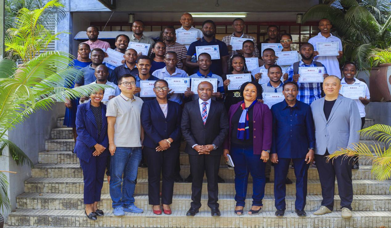 在培训结业仪式上,来自中国的参训教师与达累斯萨拉姆大学相关领导一同为表现优异的学员颁发结业证书。