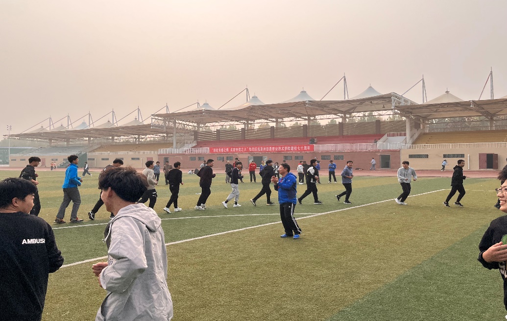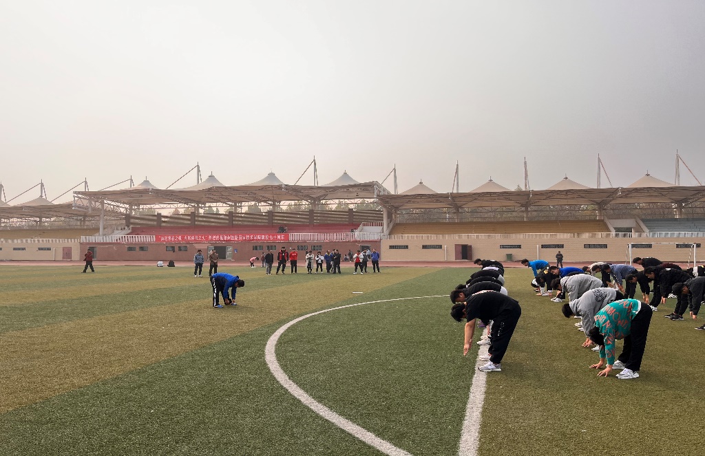 臧老师带领同学们进行徒手操拉伸和体育游戏