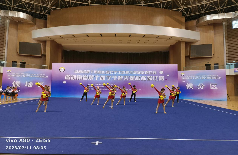 7月12至15日,河南省第十四届运动会学生组健美操啦啦操比赛在黄河科技学院举行。本次大赛共有来自全省的39所高校参赛。beat365健美操队经过教练团队的辛勤指导、精心打磨,运动员的刻苦训练,最终荣获专科组“轻器械健身操规定动作”第二名、“花球啦啦操规定动作”第三名、“花球啦啦操自选动作”第四名的优异成绩。、