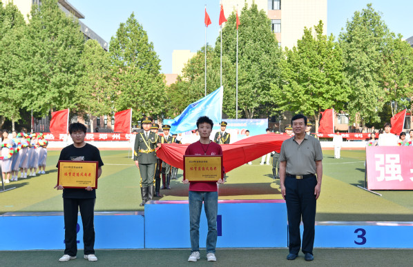 在热烈的掌声中,学校领导为获奖集体、运动员颁奖。