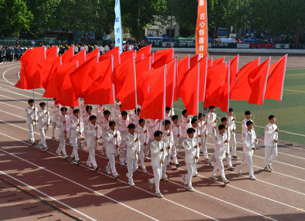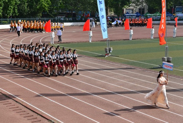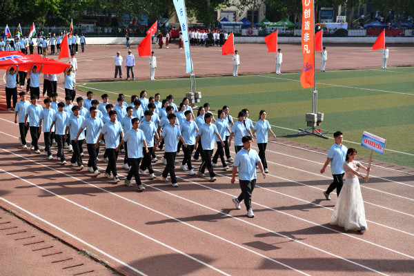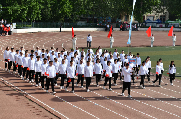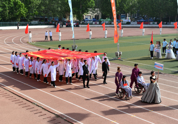 伴随着激昂的《运动员进行曲》,国旗、会徽、标语、红旗、花环5个特色方阵,16支“书院+学院”学生方阵队伍、教工代表队依次步入会场。