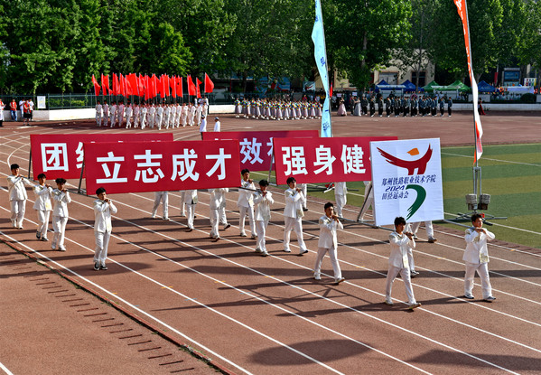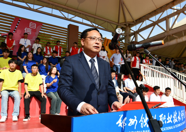 庄严的升国旗、奏唱国歌仪式之后,谢乾致开幕词。他代表学校向筹备运动会付出辛勤努力、无私奉献的全体工作人员表示感谢,向刻苦训练、积极备战的参赛运动员及同学们表示问候。谢乾表示,近年来,学校坚持“根植铁路、服务河南、面向全国、走向世界”的办学定位,构建“轨道为主、融合发展、数智赋能、开放办学”的发展模式,走出了一条“培养智能高铁运维高端技术技能人才、服务高铁安全智慧运行”的特色办学之路,实现了办学历史上的高质量、跨越式发展。全校师生要持续发扬“积极进取、勇于争先”的精神,凝聚信心和力量,书写拼搏和梦想,奋力谱写学校事业高质量发展的新篇章。