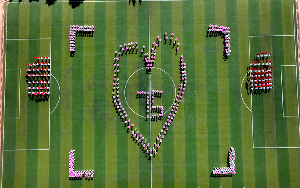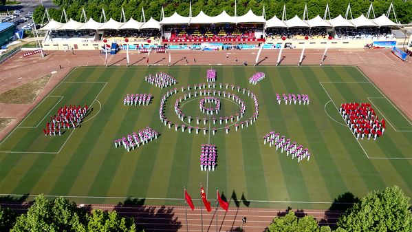 开幕式后,大型团体操表演。近500名学生手握花伞、挥动红旗,随着灵动的节奏变换队形,在音乐的海洋里舞动青春,共同为中华人民共和国成立75周年献礼。
