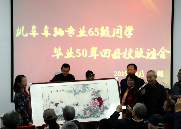 4月27日上午,65级校友返校联谊会在幸福校区退休职工活动大厅举行。招生就业处、机车车辆学院负责人参加相关活动并介绍学校发展现状。会上,校友代表向母校赠送了由65级2班马美娥同学创作并经中国龙文化书画院院长胡源智先生亲笔书写的书法作品《促拍满路花:离校五十年相聚》和65级6班张素贤校友的绘画作品《桃李满天下——牡丹图》。校友们还进行了文艺汇演,载歌载舞表达对母校对美好生活的热爱之情。联谊活动在“难忘今宵”的集体合唱声中圆满结束!