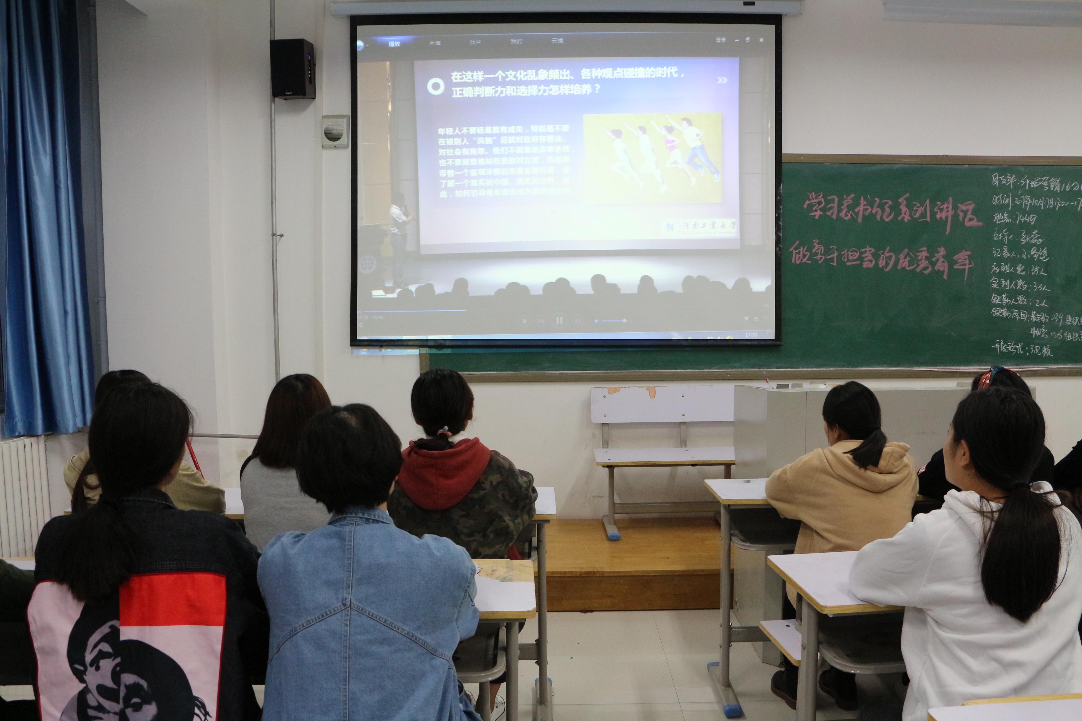 为学习习总书记的重要讲话精神,提高大学生精神文化建设。2018年10月,各院系陆续开展“学习总书记系列讲话,做勇于担当的优秀青年”主题团课, 此次团课的开展形式是视频,视频中,丁建波教授从确立人生方向,传承传统文化,坚持文化自信和实现人生价值四个方面向同学们详细讲解了习近平总书记的重要讲话精神。勉励同学们系好人生第一扣,树立正确的人生观价值观。幽默风趣而又内容丰富的演讲吸引了同学们的眼光,随着一阵阵轻松的笑声,同学们对于习近平总书记的重要讲话精神有了更加深刻的了解。 本次团课旨在加深广大师生对于习近平总书记的重要讲话精神的理解。促进了大学精神文化建设。听党话,跟党走。方能不忘初心,砥砺前行。