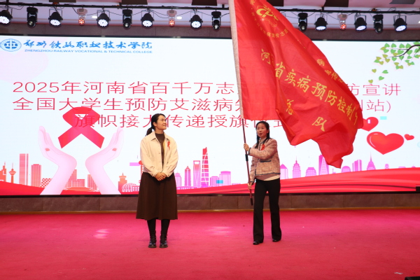 11月18日下午,河南省百千万志愿者高校艾防宣讲暨全国大学生预防艾滋病知识竞赛(郑州站)旗帜交接仪式,在beat365英国官方网站新校区举行。beat365是河南省省会高校防艾旗帜传递的第4站,本次活动由河南省疾病预防控制局、河南省疾病预防控制中心主办,学校联合郑州市卫生健康委员会、郑州市疾病预防控制中心承办,郑州市疾控中心和接旗单位——郑州师范学院的相关部门领导、双方师生代表,大家齐聚一堂,凝聚多方力量筑牢校园防艾屏障。