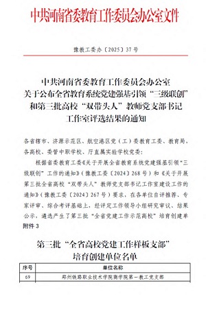 近日,中共河南省委教育工作委员会发布《关于公布全省教育系统党建强基引领“三级联创”和第三批高校“双带头人”教师党支部书记工作室评选结果的通知》(豫教工委办〔2025〕37号),商学院第一教工党支部成功入选第三批“全省高校党建工作样板支部”培育创建单位,这是我院在基层党建工作领域取得的又一重要成果。