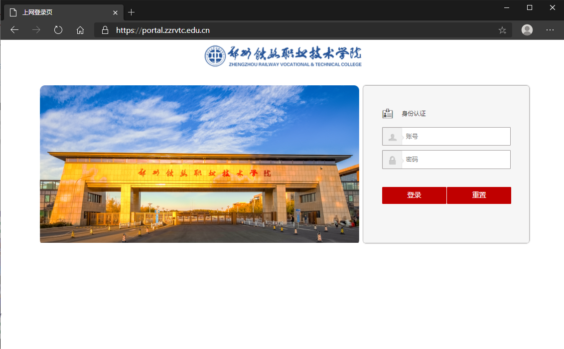 打开移动终端无线网络设置,选择ZZRVTC-OFFICE并连接,在浏览器中输入登录地址https://portal.zzrvtc.edu.cn/ (请在浏览器中收藏此网址)进入到登陆界面中(图1),输入账号密码后登录,即可认证上网