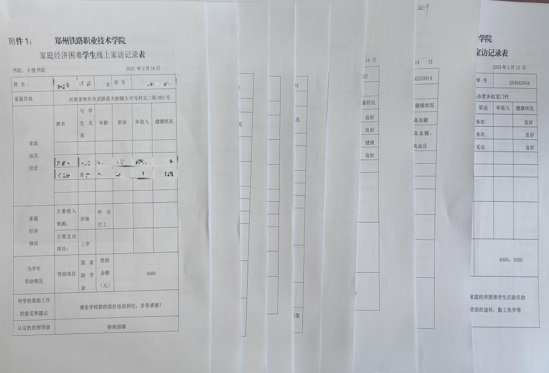 为使线上家访做到有序、有效,家访活动开始之前,全体辅导员认真准备,以班级为单位制定了详细的线上家访活动方案,并结合学生特点,通过视频连线、通讯方式,分组分批全方位开展线上家访活动,准确地摸查学生实际情况,有针对性地做好学生资助管理服务工作。线上家访后,辅导员们及时填写家访记录,汇总家访情况,总结和完善家访工作,为以后的家访工作积累经验。