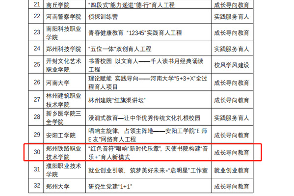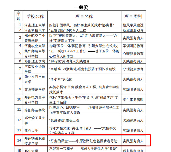近日,河南省教育厅下发了《关于2022年普通高等学校学生工作优秀成果项目获奖名单的公示》,根据《河南省教育厅办公室关于组织开展2022年普通高等学校学生工作优秀成果项目评选的通知》要求,经高校推荐、省教育厅组织专家评审,通过网络评审、专家评议、现场展示、专家终审等环节,评选出2022年普通高等学校学生工作优秀成果项目一等奖20名、二等奖30名、三等奖40名。beat365实践服务育人《“行走的课堂”——中原铁路红色基因青春寻访》项目荣获一等奖,成长导向教育《“红色音符”唱响“新时代华章”,天使书院构建“音乐+”育人新模式》项目荣获三等奖。