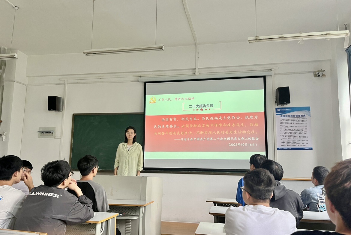 5月16日,二七书院辅导员任意君在7215教室以《不负人民,增进民生福祉》为题,希望同学们按照习近平总书记的要求,干在实处,走在前列,在推进民生福祉中勇当先锋。