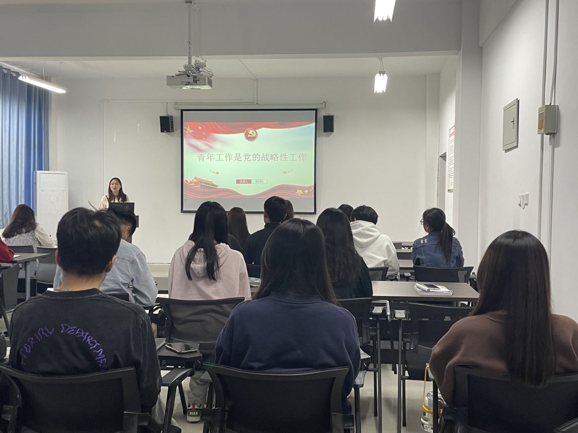 4月26日,丝路书院辅导员索利巧在党团活动室以《青年工作是党的战略性工作》为题,告诫同学们要坚定不移听党话跟党走,怀抱梦想又脚踏实地,敢想敢为又善作善成,让广大学生的青春在全面建设社会主义现代化国家的火热实践中绽放绚丽之花。