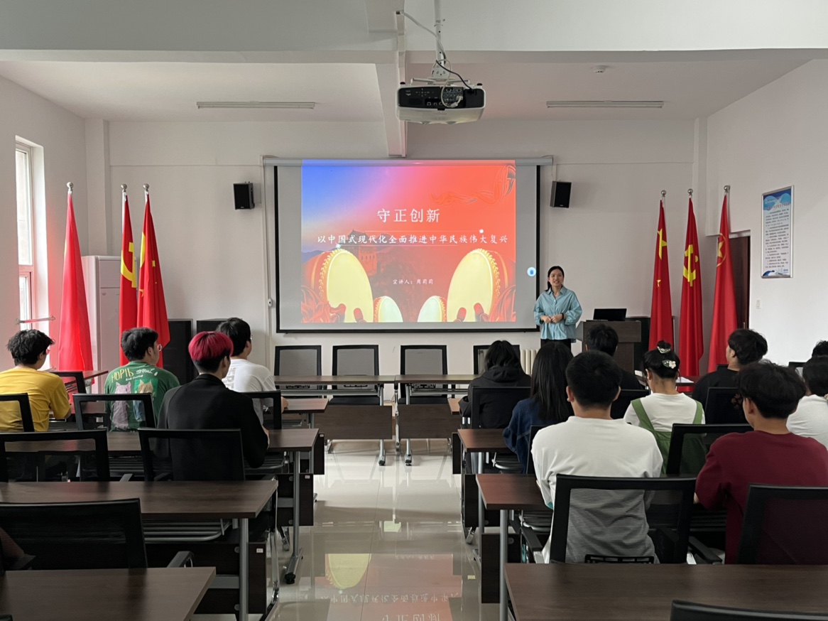 5月30日,复兴书院辅导员周莉莉在书院活动室给学生干部宣讲,她以《守正创新:以中国式现代化全面推进中华民族伟大复兴》为题,勉励同学们在推进中国化时代化建设的过程中,练就过硬本领,积极躬身实践,培养科学思维方法和思维能力,坚持守正创新的世界观和方法论,书写无愧于时代的人生华章。