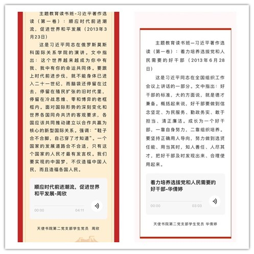 学生党员们分享和朗读《习近平著作选读》部分篇章,畅谈读书感受,并表示会把自己的思想和行动统一到习近平新时代中国特色社会主义思想建设上来,与时代恢弘之声同频共振。
