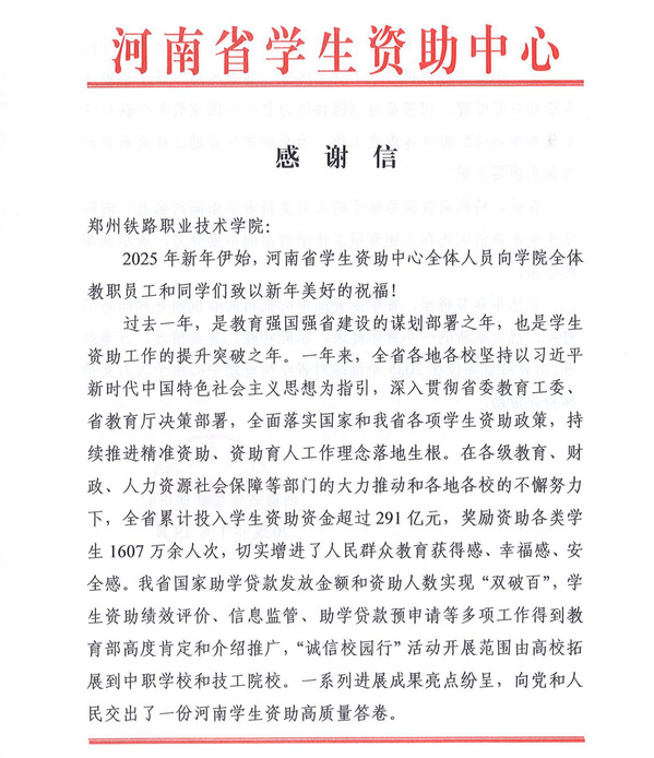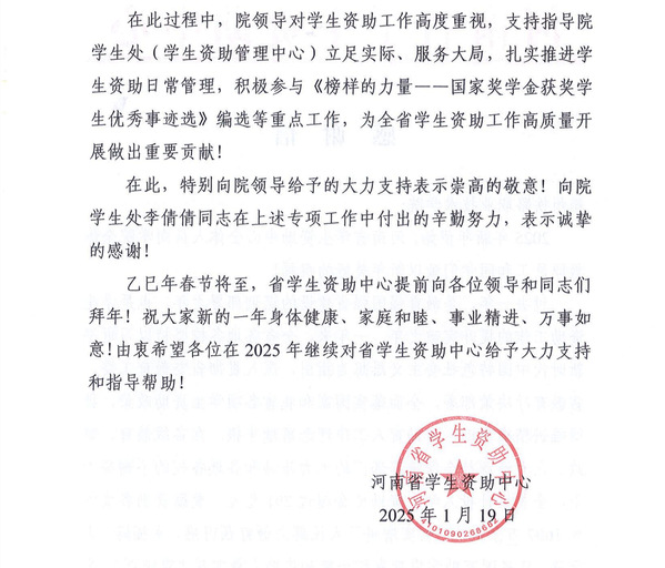近日,河南省学生资助中心向beat365发来感谢信,肯定beat365精准资助和资助育人工作的全面落实成效,并对beat365扎实推进学生资助日常管理以及积极参与河南省学生资助中心工作表示感谢。