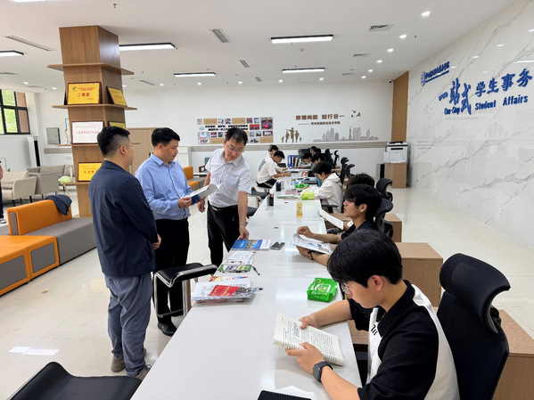 梁明亮首先来到学校“一站式”学生事务服务中心,与现场各窗口单位人员和值班学生助理亲切交谈,对各单位入驻情况、学生事务办理、接诉即办机制等方面的工作深入了解,充分肯定了相关建设成果。随后走访大学生心理健康教育中心,听取心理健康教育师资队伍、危机干预、场地设施、活动开展等情况汇报。座谈会上,学生处领导班子结合学校学生工作情况,对近期工作中的重点事项、突出问题、下一步工作计划进行汇报。
