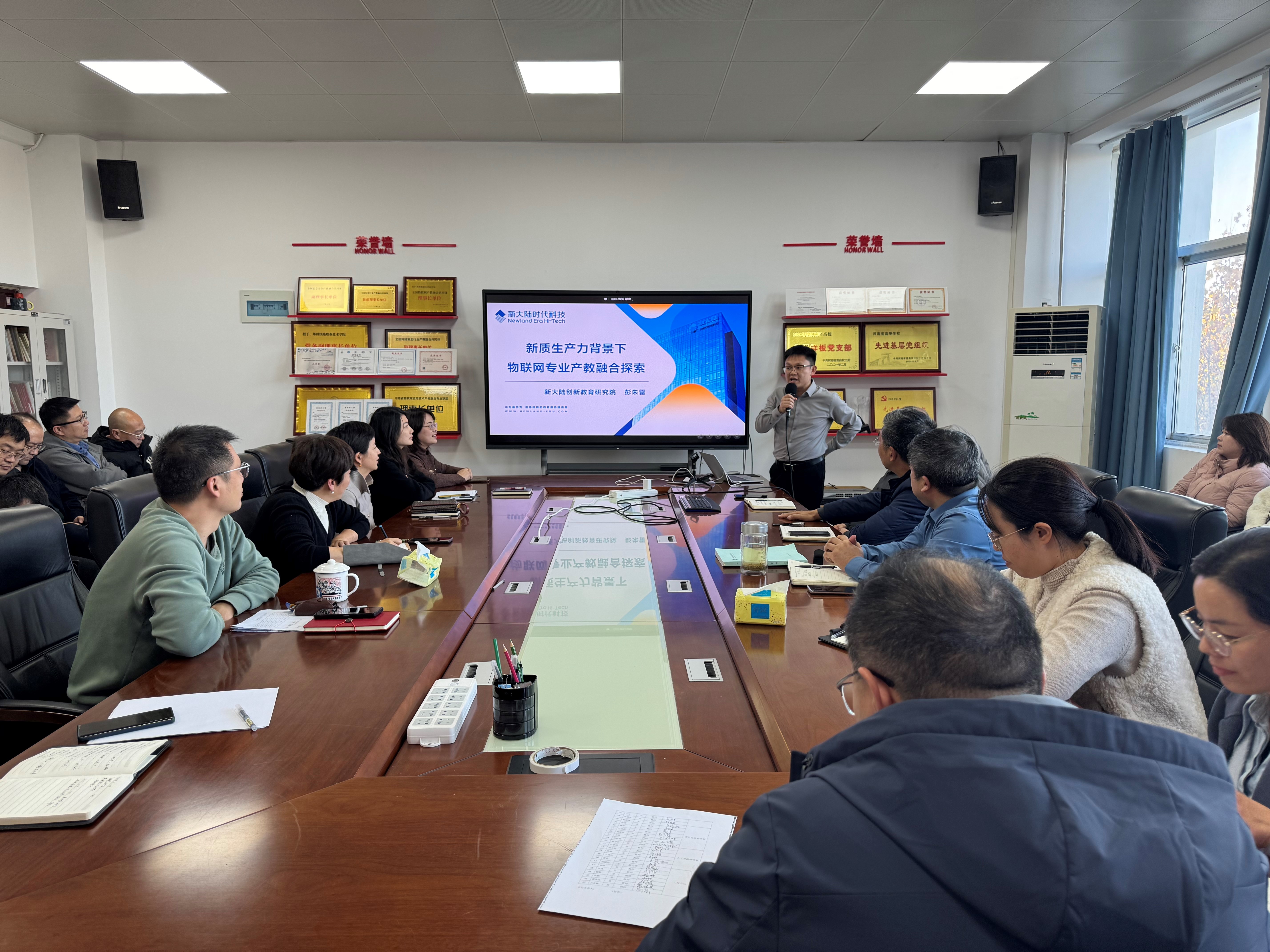讲座在彭工对新质生产力概念的精彩解读中拉开帷幕,他深入剖析了新质生产力在信息化、数字化、智能化时代的重要价值与意义。随后,彭工详细介绍了北京新大陆时代科技有限公司通过校企合作、工学交替、订单培养等多元化方式,实现教育内容与产业需求精准对接的生动实践案例。同时,他强调了公司在校企课题项目、课程建设以及科研成果转化与应用等方面的显著优势与坚定合作意愿。彭工认为,随着新质生产力的蓬勃发展,物联网专业产教融合将更加注重跨学科、跨领域的深度合作与交流,致力于培养具备复合型知识与技能的高素质人才。讲座尾声,人工智能学院的教师们与彭工进行了热烈的互动交流。
