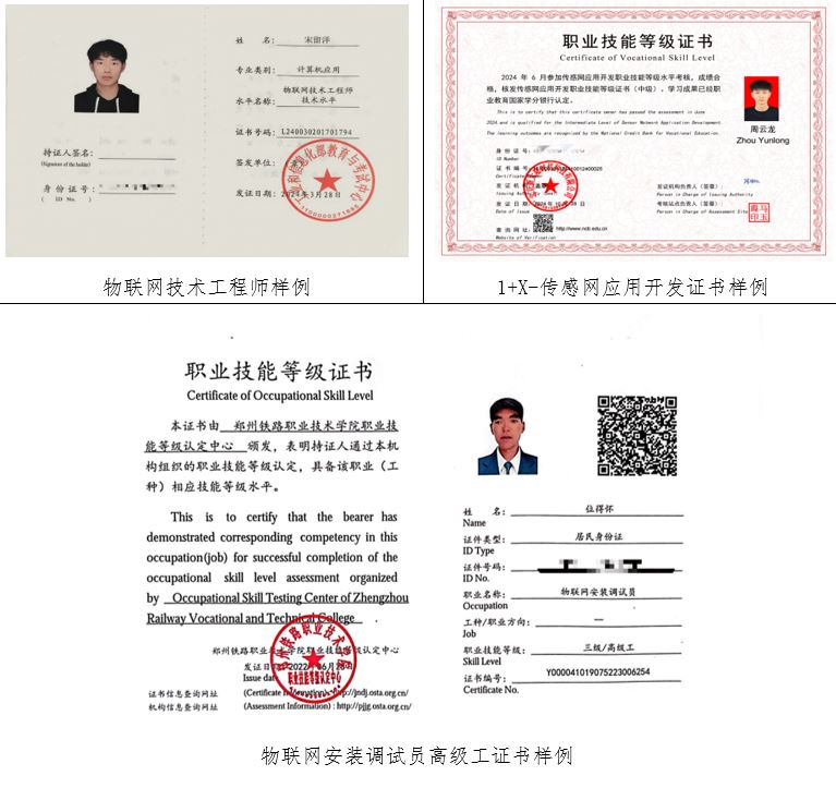 专业推行双证书培养模式,学生毕业可取得物联网工程师、1+X - 传感网应用开发中级、物联网安装调试员(中级工、高级工)等证书,考证通过率达 95%以上。