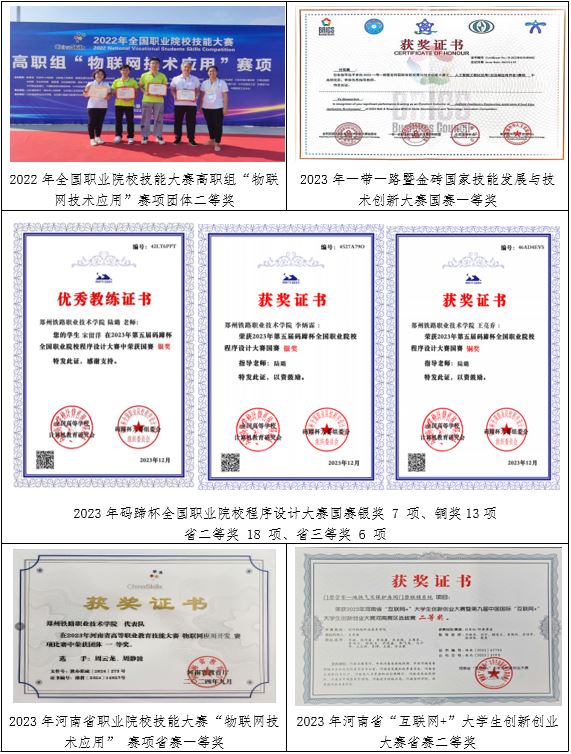 6.2023年河南省行业职业技能竞赛中,物联网安装调试员赛项获一等奖1项,优秀教练1名;智能硬件装调员赛项职工组二等奖1项,学生组三等奖1项。