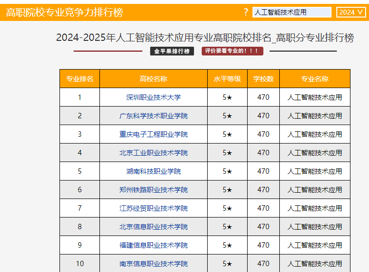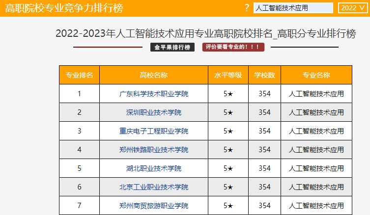 专业在金平果高职院校专业竞争力排行榜一直排在前列:2022年在全国354所高职院校中排名第4,2024年在全国470所高职院校中排名第6。